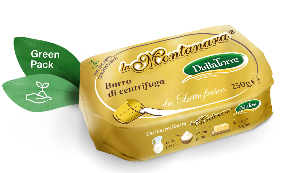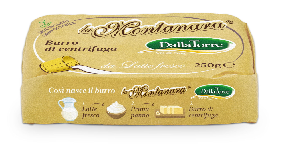 Dettagli del prodotto: Burro La Montanara 250 g. incarto in pergamena vegetale compostabile.