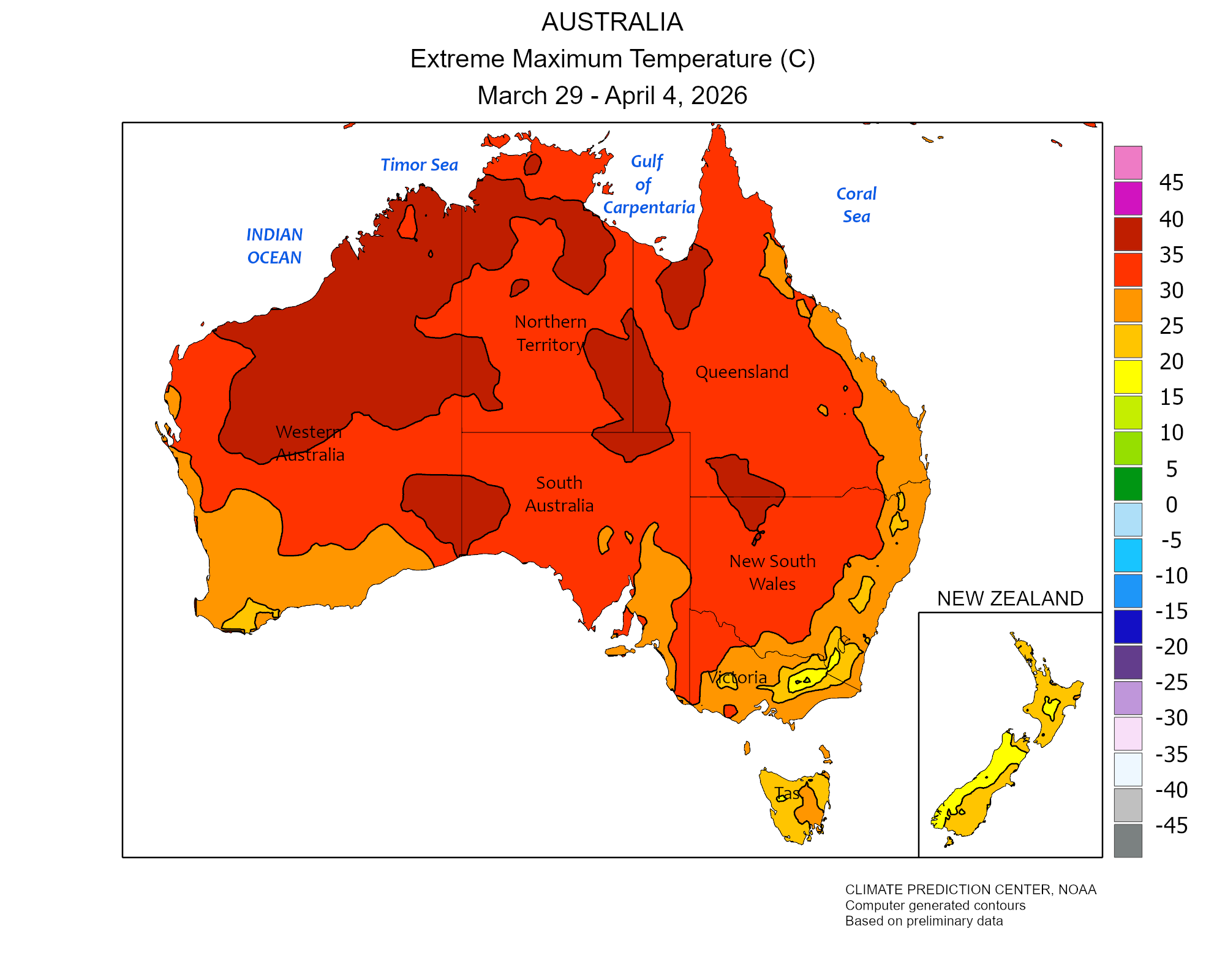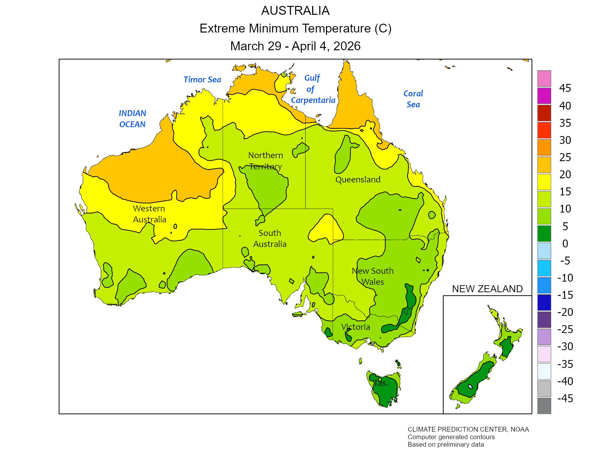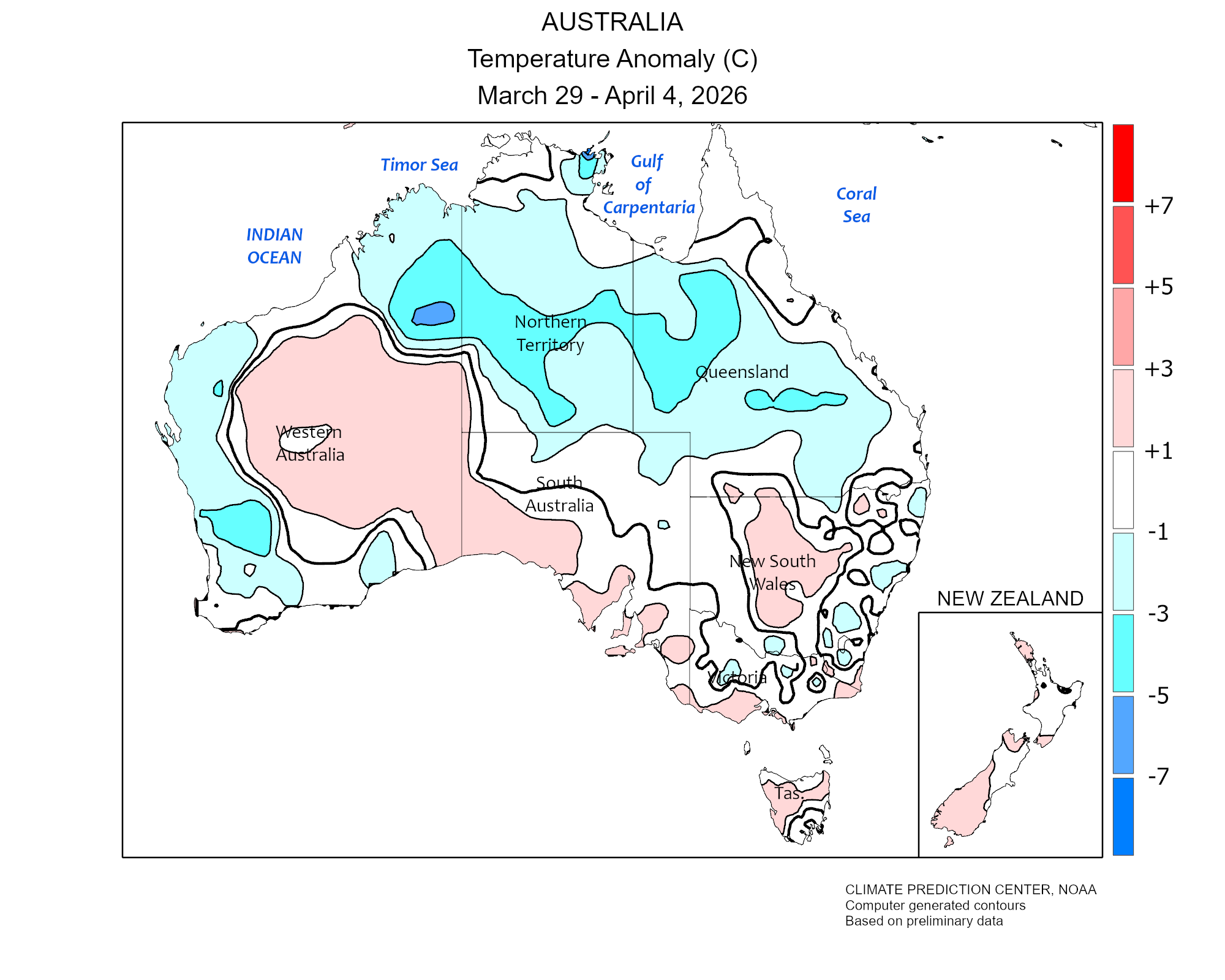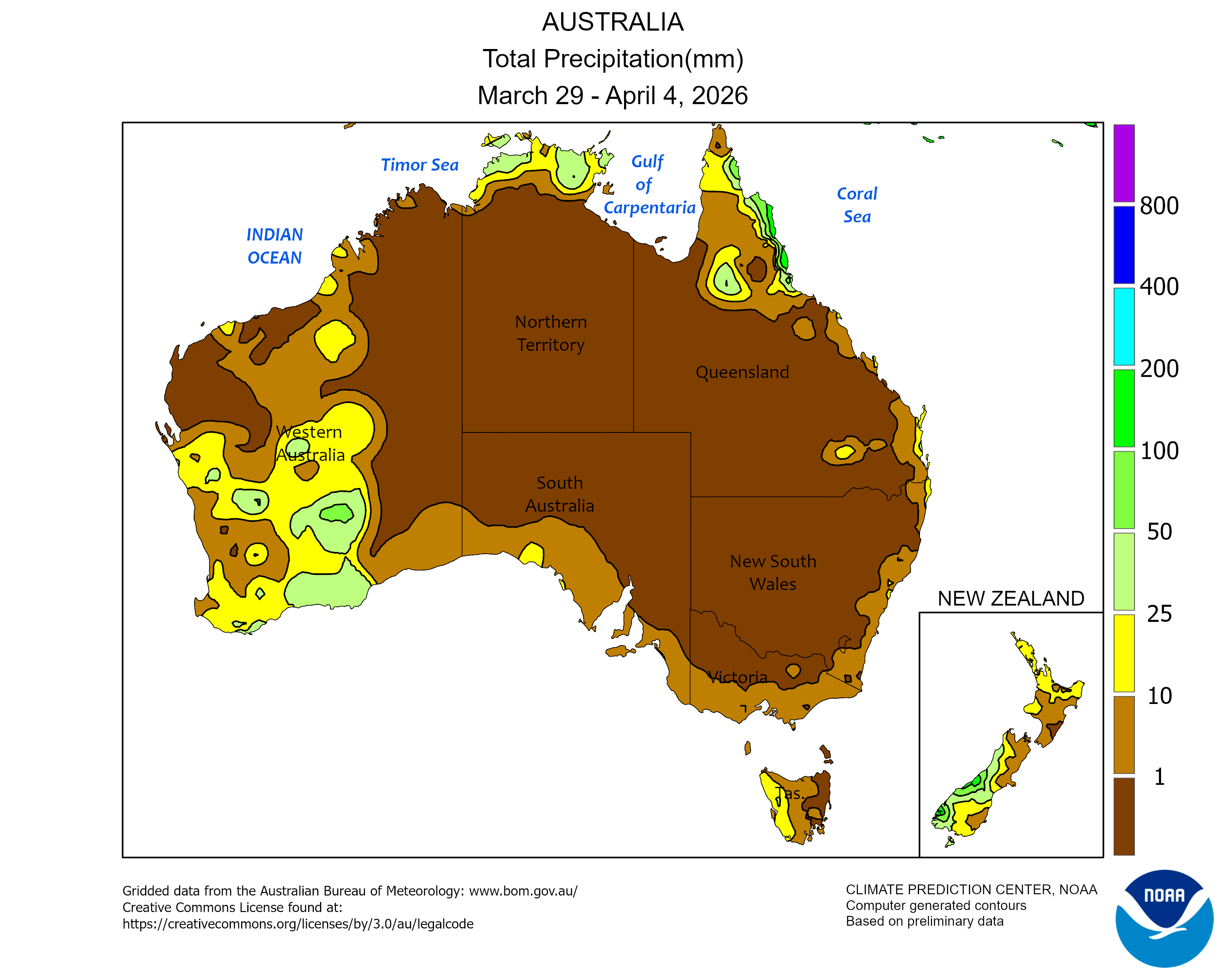 Ultimi rapporti meteo settimanali relativi all'andamento di precipitazioni e temperature in Oceania.