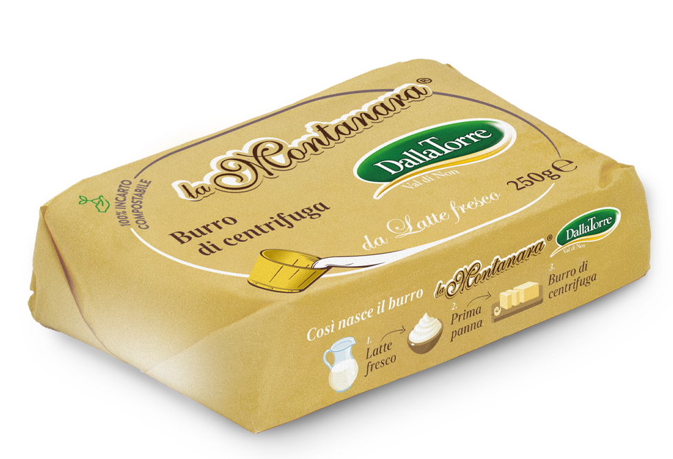 Dettagli del prodotto: Burro La Montanara 250 g. incarto in pergamena vegetale compostabile.