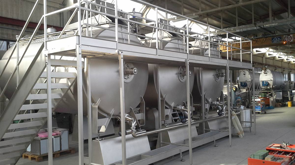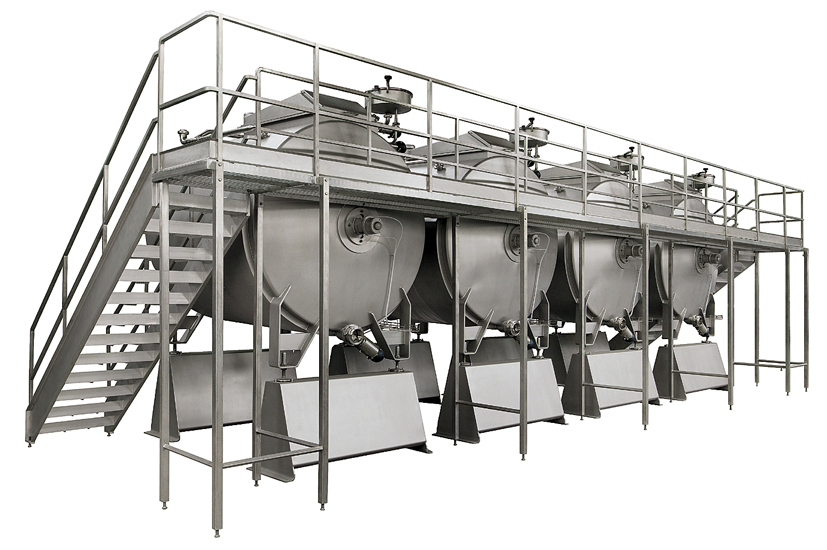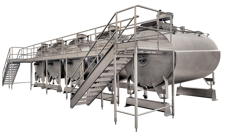 La macchina è costituita da una vasca cilindrica a sezione circolare, disposta con l’asse longitudinale in posizione orizzontale, fissata su quattro robusti sostegni in acciaio inossidabile; la parte inferiore della vasca, dotata di intercapedine riscaldata a vapore, è inclinata verso lo scarico; quest’ultimo è costituito da una valvola pneumatica on-off DN100 utilizzata per lo scarico della cagliata e delle soluzioni di lavaggio.