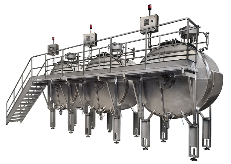 All'interno della vasca sono montate le tubazioni terminanti con due turbine di lavaggio rotanti per il risciacquo a fine ciclo o la sanificazione automatica al termine della lavorazione; una turbina più piccola è disposta nella vaschetta di dosaggio del caglio. Le soluzioni di lavaggio vengono evacuate dalla vasca tramite lo scarico DN100 dotato di valvola pneumatica on-off.