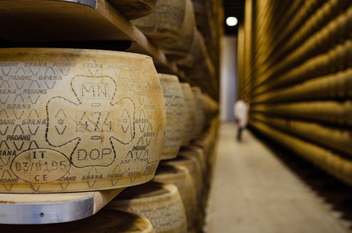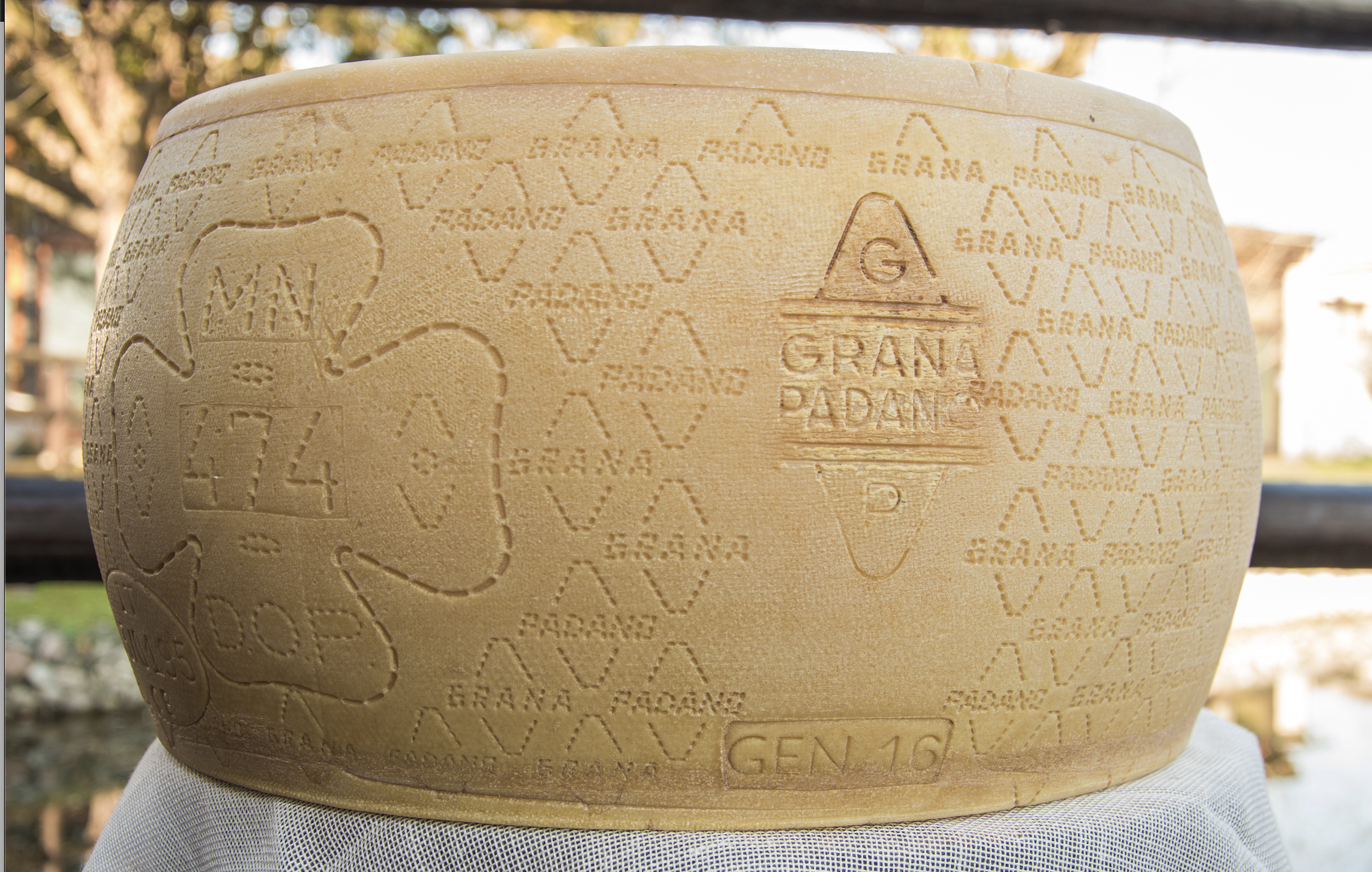Grana Padano prodotto con il latte da bovine alimentate con i prati stabili della valle del Mincio, sale e caglio.