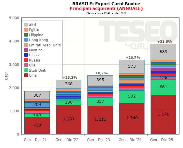 Il Brasile è il principale esportatore mondiale, con flussi concentrati sull’Asia, in particolare Cina, ma anche Medio Oriente. Ostacoli logistici o cali di domanda potrebbero spingere parte delle esportazioni verso mercati alternativi, aumentando la concorrenza e influenzando i prezzi internazionali, alla luce di prezzi particolarmente competitivi della carne brasiliana (5,27 $/kg il prezzo medio delle carni congelate contro i 6,44 $/kg dell’Australia).