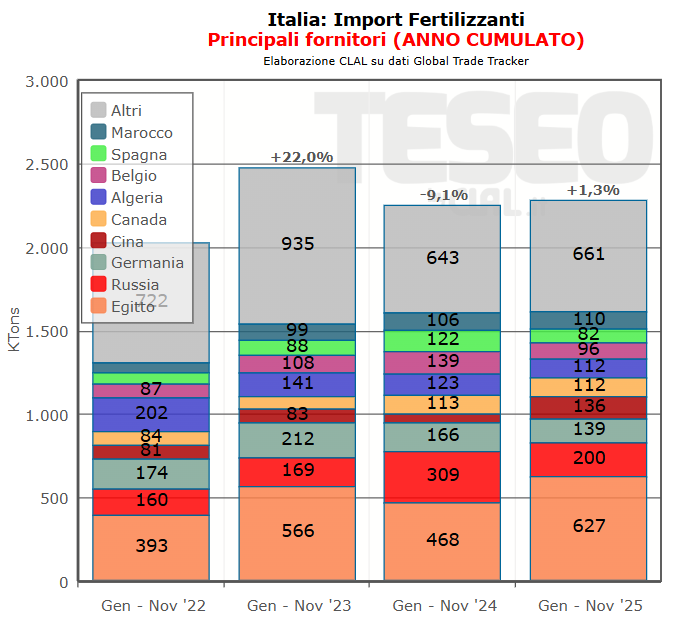 Anche per l’Italia i dati non denotano una scarsità di disponibilità di fertilizzanti: da gennaio a novembre 2025 le importazioni hanno superato 2,2 milioni di tonnellate, con l’urea a circa 970 mila tonnellate (prezzo medio all’importazione 404 €/ton). I fertilizzanti azotati nel loro insieme hanno registrato volumi in crescita rispetto al 2024, accompagnati da prezzi medi più elevati, in linea con l’andamento internazionale. Tra i principali fornitori figurano Egitto, Russia, Cina, Canada, Algeria e altri Paesi europei, a conferma di una forte diversificazione delle origini, con l’Egitto ormai partner di riferimento per l’urea.