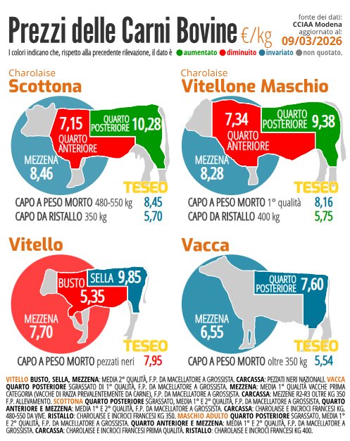 L’immagine mostra le quotazioni correnti delle carni bovine secondo la Camera di Commercio di Modena. I valori indicati rappresentano i prezzi franco partenza (f.p.) rilevati dal macellatore al grossista, quindi all’uscita dal macello e non al consumo finale.