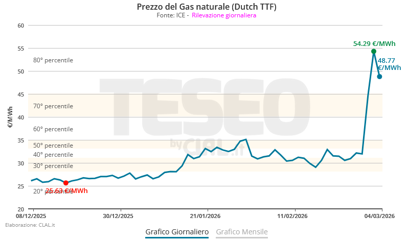 L’impatto sui mercati è stato immediato: il Brent supera gli 80 $/barile (+20%) e il gas naturale europeo, scambiato sul mercato di riferimento Dutch TTF, quota oltre 50 €/MWh (+70%), con ulteriori possibili rialzi.